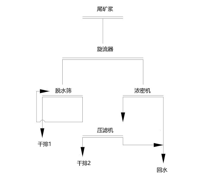 隔膜式壓濾機的工作效果突出,并有優良性能,全自動化、改善維護效果、降低運營成本,濾餅水分低于傳統板框壓濾機和帶式壓濾機。根據我們的經驗,由于銅尾礦具有固含量比較高,礦顆粒比較細,粘度大的特點。如果采用常規的板框壓濾機進行壓濾脫水,周期較長,效率較低。為了解決該問題,可以采用如下工藝:旋流器—脫水篩—濃密機—隔膜壓濾機。該工藝不僅僅適用于顆粒較細的尾礦,并且有一次性投入小,占地小,效率高,脫水效果好,運行成本低的特點。具體如下圖示:
