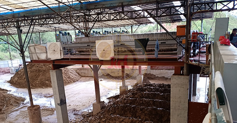 4、高干度,高產能,廢渣可壓榨至含水率30%以下,低至15%,比普通廂式壓濾機低10個點,比帶式壓濾機低15個點